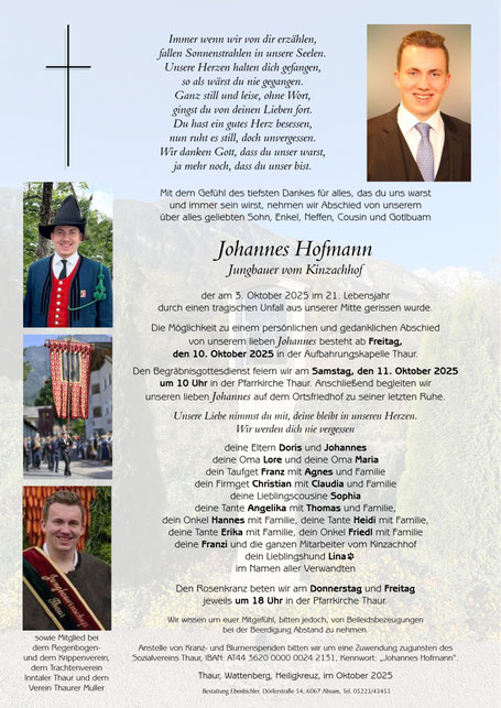 Mit großer Betroffenheit haben wir vom viel zu frühen Tod von Johannes erfahren. Es ist schwer, die passenden Worte zu finden für diesen unfassbaren Verlust eines jungen Menschen, der uns allen mit seiner freundlichen Art und seinem Engagement im Krippenverein Thaur in Erinnerung bleiben wird.